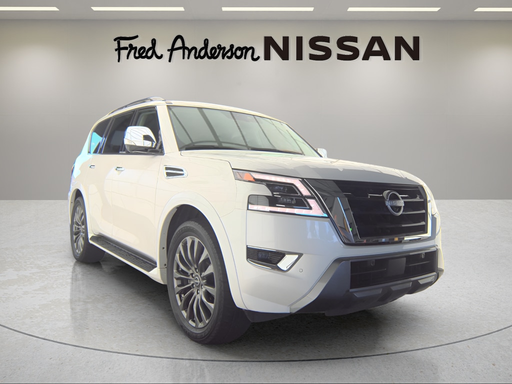 Check out all these great options Captain's Chairs Package (2nd Row Captain's Chairs and 2nd Row Center Console w/Padded Armrest), Cargo Package, 13 Speakers, 2.937 Axle Ratio, 3rd Row Carpeted Floor Mats - Captain Seat, 3rd row seats: split-bench, 4-Wheel Disc Brakes, ABS brakes, Air Conditioning, Alloy wheels, AM/FM radio: SiriusXM, Anti-whiplash front head restraints, Auto High-beam Headlights, Auto tilt-away steering wheel, Auto-dimming door mirrors, Auto-dimming Rear-View mirror, Auto-leveling suspension, Automatic temperature control, Brake assist, Bumpers: body-color, Climate-Controlled Front Bucket Seats, Delay-off headlights, Driver door bin, Driver vanity mirror, Dual front impact airbags, Dual front side impact airbags, Electronic Stability Control, Emergency communication system: NissanConnect Services, Exterior Parking Camera Rear, Four wheel independent suspension, Front anti-roll bar, Front Bucket Seats, Front Center Armrest, Front dual zone A/C, Front fog lights, Front reading lights, Fully automatic headlights, Garage door transmitter: HomeLink, Heated door mirrors, Heated front seats, Heated rear seats, Heated steering wheel, HVAC memory, Illuminated entry, Illuminated Kick Plates, Illuminated Scuff Plate, Knee airbag, Leather Shift Knob, Leather steering wheel, Low tire pressure warning, Memory seat, Navigation System, Nissan USB Charging Cable Set, Occupant sensing airbag, Outside temperature display, Overhead airbag, Overhead console, Panic alarm, Passenger door bin, Passenger vanity mirror, Power door mirrors, Power driver seat, Power Liftgate, Power moonroof, Power passenger seat, Power steering, Power windows, Quilted Leather Seat Trim, Radio: NissanConnect w/SiriusXM, Rain sensing wipers, Rear air conditioning, Rear anti-roll bar, Rear reading lights, Rear seat center armrest, Rear window defroster, Rear window wiper, Reclining 3rd row seat, Remote keyless entry, Roof Rail Cross Bars - Gun Metal, Security system, Speed control, Speed-sensing steering, Speed-Sensitive Wipers, Split folding rear seat, Spoiler, Steering wheel memory, Steering wheel mounted audio controls, Tachometer, Telescoping steering wheel, Tilt steering wheel, Traction control, Trip computer, Turn signal indicator mirrors, Variably intermittent wipers, Ventilated front seats, Voltmeter, and Wheels: 22" x 8J Machine-Faced w/Tinted Clear Coat *** AVAILABLE AT FRED ANDERSON NISSAN OF RALEIGH. CALL US NOW 919-787-0254*** Nissan Certified. Armada Aspen White Tricoat Platinum 4WD 7-Speed Automatic 5.6L V8 DOHC 32V LEV3-ULEV125 400hp