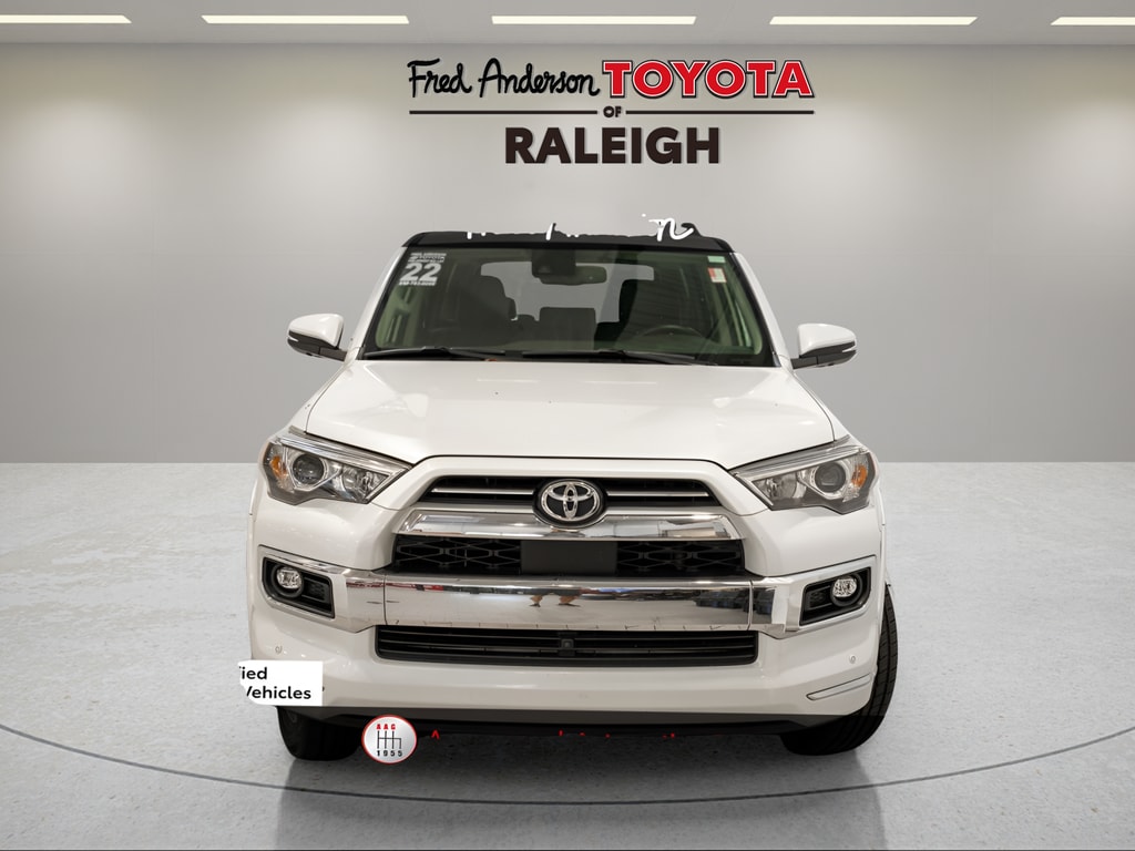 CARFAX One-Owner. Clean CARFAX. Priced below KBB Fair Purchase Price! *Full Family Plan* INCLUDES OIL CHANGES FOR LIFE!, Only One Owner and Accident Free Carfax!!, Navigation, Bought new here at Fred Anderson Toyota, Alloy wheels / Premium Wheels, Bluetooth, Hands-Free, Leather Seats, Local Trade, Star Safety System with Active Breaking Technologies, Keyless Entry, Keyless Start, Backup Camera, Sunroof / Panoramic Roof, Trailer Hitch, We will buy your car and pay top dollar for it, even if you don't buy ours!!, USB Port, 4WD, Black/Graphite w/Leather Seat Trim, Blind Spot Monitor (BSM), Dual Zone Auto Climate Control, Garage Door Opener, Limited Package, Moonroof w/Tilt Up & Slide, Navigation System, Outside Rear View Mirror, Panoramic Back Monitor, Silver Roof Rails. Check out all these great options Limited Package (Blind Spot Monitor (BSM), Dual Zone Auto Climate Control, Garage Door Opener, Moonroof w/Tilt Up & Slide, Outside Rear View Mirror, Panoramic Back Monitor, and Silver Roof Rails), Toyota Gold Certified Certified, 4WD, Black/Graphite w/Leather Seat Trim, Navigation System, 15 Speakers, 3.727 Axle Ratio, 4-Wheel Disc Brakes, ABS brakes, Air Conditioning, Alloy wheels, AM/FM radio: SiriusXM, Anti-whiplash front head restraints, Apple CarPlay/Android Auto, Auto High-beam Headlights, Auto-dimming Rear-View mirror, Automatic temperature control, Brake assist, Bumpers: body-color, Compass, Delay-off headlights, Driver door bin, Driver vanity mirror, Dual front impact airbags, Dual front side impact airbags, Electronic Stability Control, Emergency communication system: Safety Connect with 1-year trial, Front anti-roll bar, Front Bucket Seats, Front Center Armrest, Front dual zone A/C, Front fog lights, Front reading lights, Front wheel independent suspension, Fully automatic headlights, Garage door transmitter: HomeLink, Heated door mirrors, Heated front seats, Heated/Ventilated Front Bucket Seats, Illuminated entry, Knee airbag, Leather Seat Trim, Low tire pressure warning, Memory seat, Occupant sensing airbag, Outside temperature display, Overhead airbag, Overhead console, Panic alarm, Passenger door bin, Passenger vanity mirror, Power door mirrors, Power driver seat, Power moonroof, Power passenger seat, Power steering, Power windows, Radio: Premium Audio w/JBL, Rear anti-roll bar, Rear seat center armrest, Rear window defroster, Rear window wiper, Remote keyless entry, Roof rack: rails only, Security system, Speed control, Speed-sensing steering, Split folding rear seat, Spoiler, Steering wheel mounted audio controls, Tachometer, Telescoping steering wheel, Tilt steering wheel, Traction control, Trip computer, Turn signal indicator mirrors, Variably intermittent wipers, Ventilated front seats, and Wheels: 20" Unique Dual 6-Spoke AlloyStop by and test drive today. Let us show you how affordable we can make it. Remember, we always give you more for your trade and we will buy your vehicle even if you don't buy one from us. See online @ www.FredAndersonToyota.com or see in person @ Fred Anderson Toyota 9101 Glenwood Ave. Raleigh NC, 27617. 2022 Toyota Certified. 4Runner Limited 4WD Blizzard Pearl 5-Speed with ECT