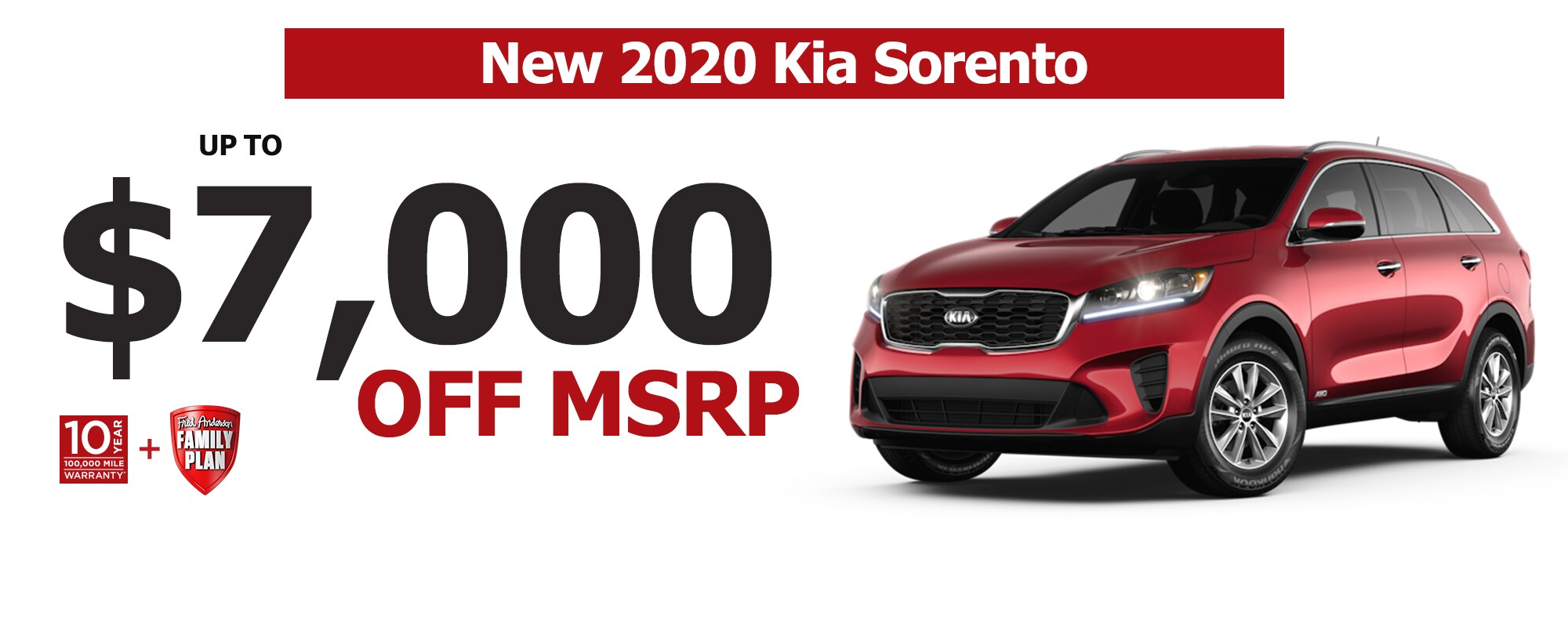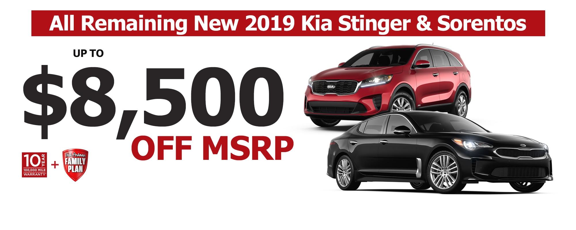 Warranties include 10-year/100,000-mile powertrain and 5-year/60,000-mile basic. All warranties and roadside assistance are limited. See retailer for warranty details; Excludes tax, tag, title, license, $649 administrative service fee; Stinger Example Stk K6070645, MSRP $35250; $8500 off includes $3,000 Kia cash and dealer discount; Sales Price $26750; Soentos Example Stk KG584187, MSRP $36135; $8500 off includes $3,500 Kia cash and dealer discount; Sales Price $27635; Ends 5.4.20.