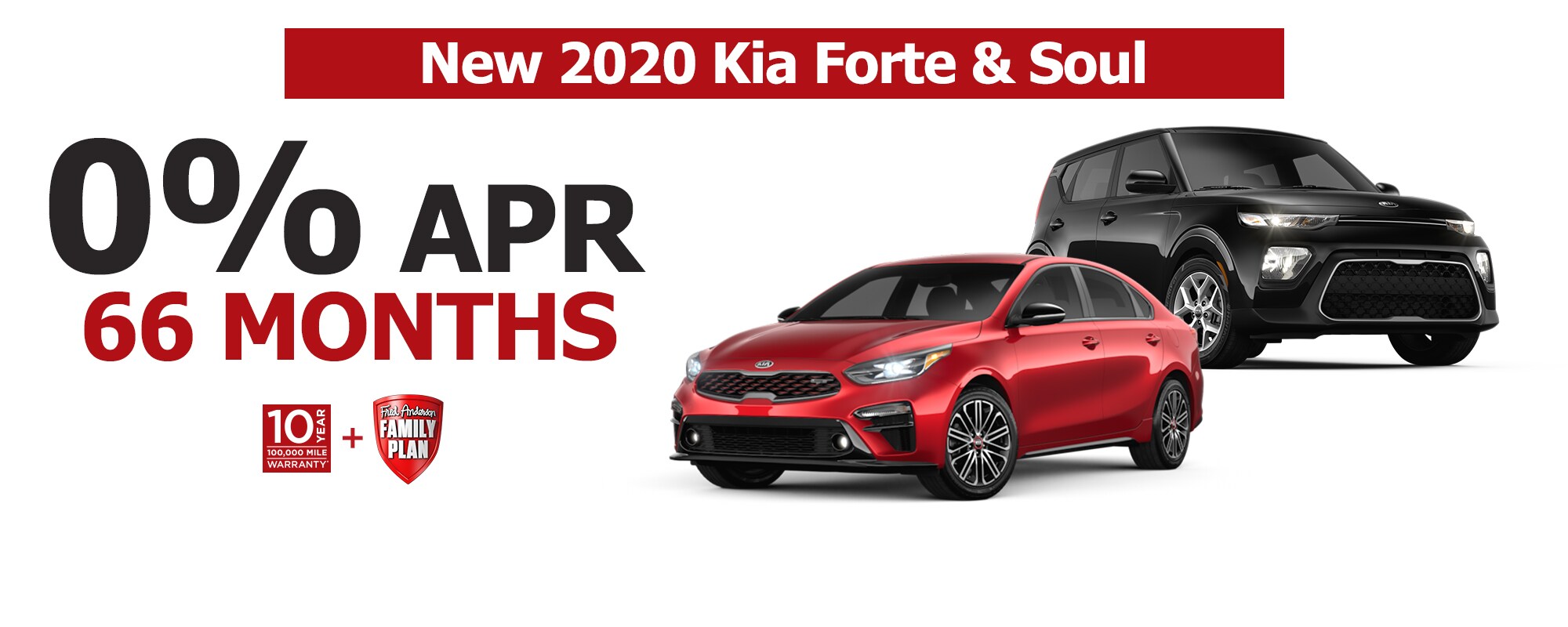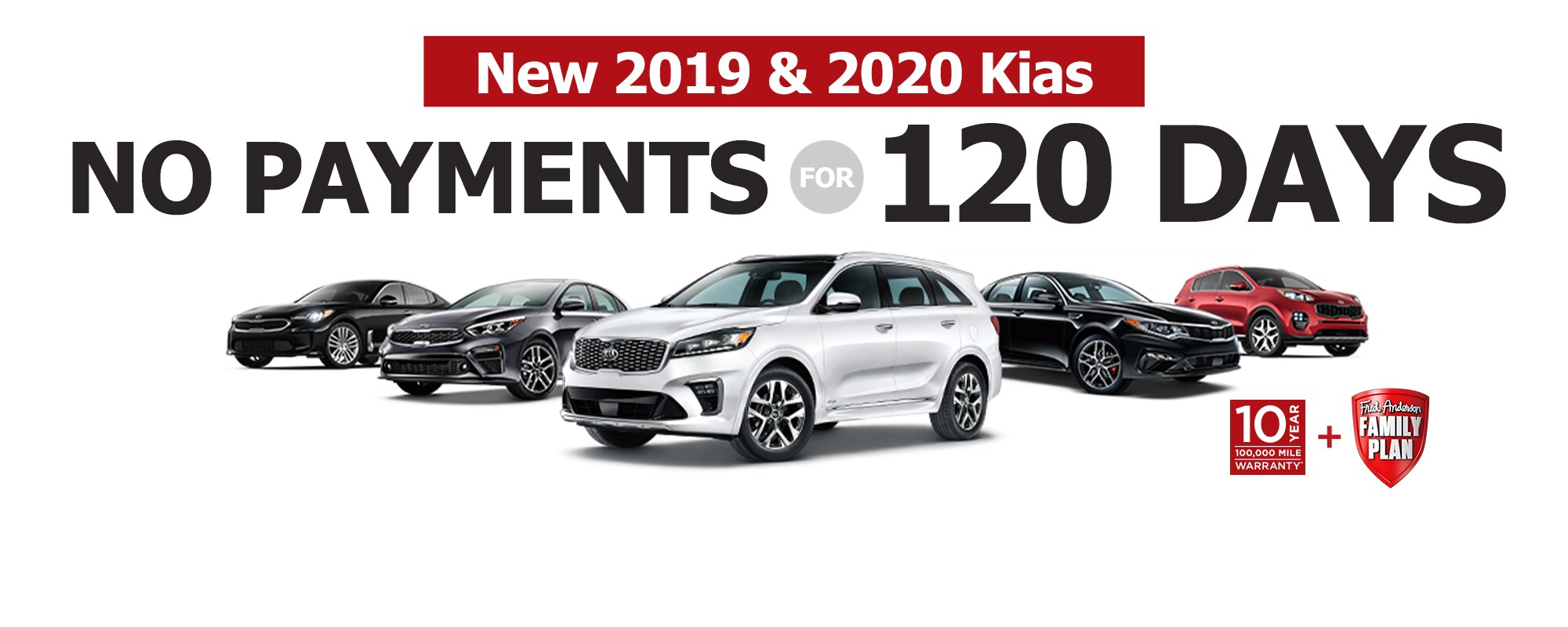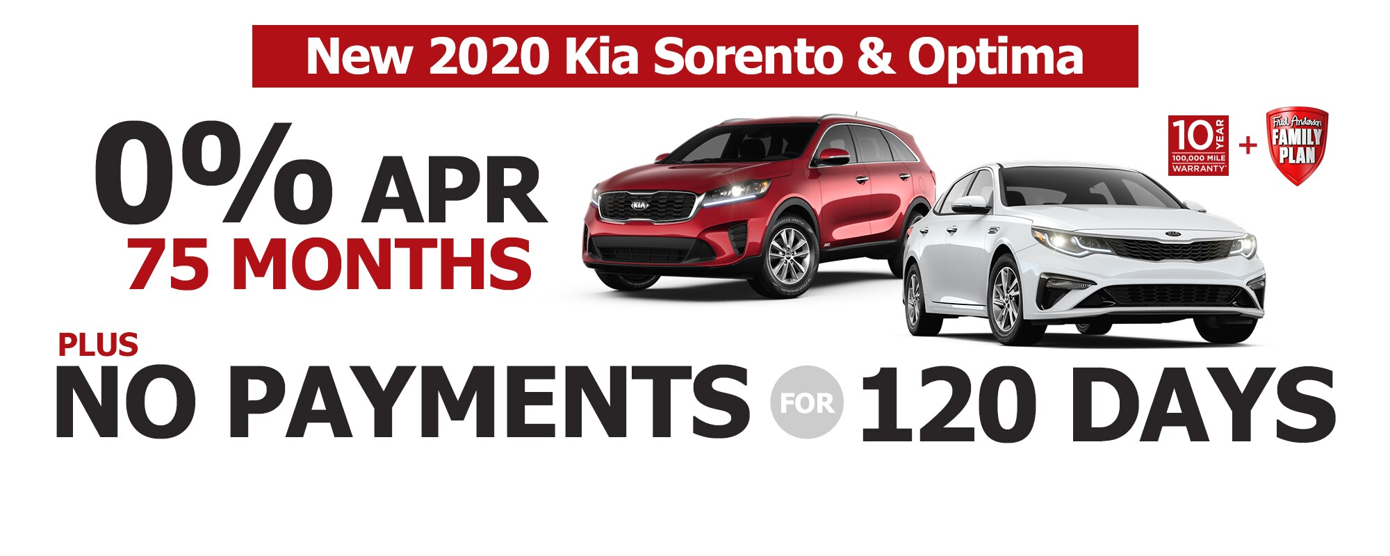 Warranties include 10-year/100,000-mile powertrain and 5-year/60,000-mile basic. All warranties and roadside assistance are limited. See retailer for warranty details; Excludes tax, tag, title, license, $649 administrative service fee; Valid up to 60 months on MY20 Forte, Soul, MY19 Niro PHEV; Valid up to 66 months on MY20 Optima, Sorento, Sportage, Sedona, Stinger & MY19 Niro RV, Niro (excl. PHEV); Valid up to 72 months on MY19 Stinger, Cadenza & K900; Requires approved credit thru KMF with 720+ credit score with Tier 1-2 credit; 120 day deferment valid on special APR programs only, customer responsible for accrued interest over 120 day period. Ends 5.4.20