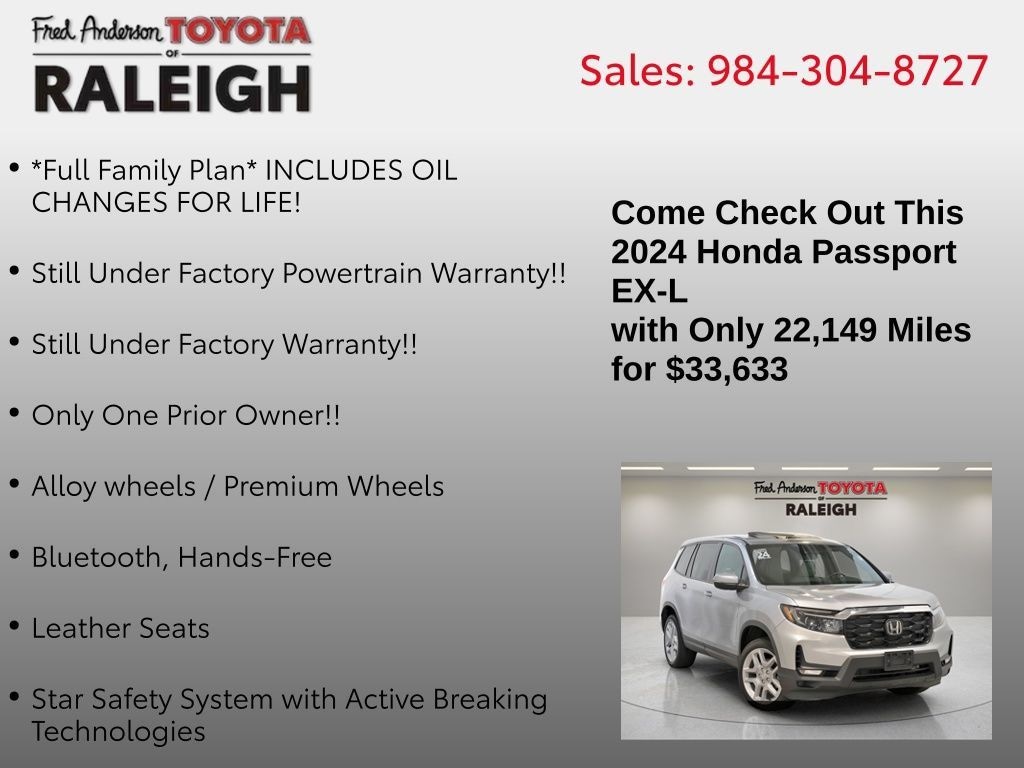 CARFAX One-Owner. Priced below KBB Fair Purchase Price! *Full Family Plan* INCLUDES OIL CHANGES FOR LIFE!, Still Under Factory Powertrain Warranty!!, Still Under Factory Warranty!!, Only One Prior Owner!!, Alloy wheels / Premium Wheels, Bluetooth, Hands-Free, Leather Seats, Star Safety System with Active Breaking Technologies, Keyless Entry, Keyless Start, Backup Camera, Sunroof / Panoramic Roof, We will buy your car and pay top dollar for it, even if you don't buy ours!!, USB Port. Check out all these great options 4-Wheel Disc Brakes, 4.334 Axle Ratio, 7 Speakers, A/V remote: CabinControl, ABS brakes, Air Conditioning, Alloy wheels, AM/FM radio: SiriusXM, Apple CarPlay/Android Auto, Auto High-beam Headlights, Auto-dimming Rear-View mirror, Automatic temperature control, Blind Spot Information (BSI) System warning, Brake assist, Bumpers: body-color, Delay-off headlights, Driver door bin, Driver vanity mirror, Driver's Seat Mounted Armrest, Dual front impact airbags, Dual front side impact airbags, Electronic Stability Control, Emergency communication system: HondaLink Assist, Exterior Parking Camera Rear, Four wheel independent suspension, Front anti-roll bar, Front Bucket Seats, Front Center Armrest, Front dual zone A/C, Front reading lights, Fully automatic headlights, Garage door transmitter: HomeLink, Heated door mirrors, Heated Front Bucket Seats, Heated front seats, Illuminated entry, Lane departure: Lane Keeping Assist System (LKAS) active, Leather-Trimmed Seats, Low tire pressure warning, Occupant sensing airbag, Outside temperature display, Overhead airbag, Overhead console, Panic alarm, Passenger door bin, Passenger seat mounted armrest, Passenger vanity mirror, Power door mirrors, Power driver seat, Power Liftgate, Power moonroof, Power passenger seat, Power steering, Power windows, Radio data system, Radio: 215-Watt Audio System w/7 Speakers, Rear air conditioning, Rear anti-roll bar, Rear reading lights, Rear seat center armrest, Rear window defroster, Rear window wiper, Remote keyless entry, Security system, Speed control, Speed-sensing steering, Split folding rear seat, Spoiler, Steering wheel mounted audio controls, Tachometer, Telescoping steering wheel, Tilt steering wheel, Traction control, Trip computer, Turn signal indicator mirrors, Variably intermittent wipers, and Wheels: 20" Sparkle Silver AlloyStop by and test drive today. Let us show you how affordable we can make it. Remember, we always give you more for your trade and we will buy your vehicle even if you don't buy one from us. See online @ www.FredAndersonToyota.com or see in person @ Fred Anderson Toyota 9101 Glenwood Ave. Raleigh NC, 27617. 2024 Honda Passport EX-L AWD Lunar Silver Metallic 9-Speed Automatic