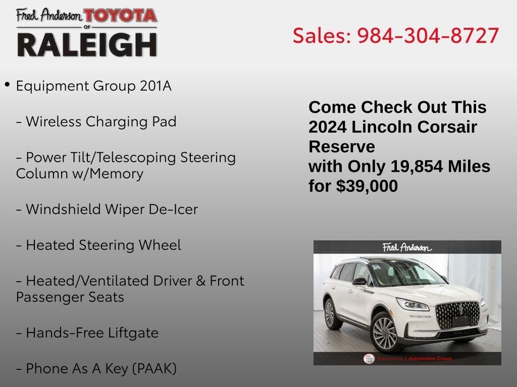 Clean CARFAX. Priced below KBB Fair Purchase Price! Still Under Factory Powertrain Warranty!!, Still Under Factory Warranty!!, Accident Free Carfax!!, Navigation, Alloy wheels / Premium Wheels, Bluetooth, Hands-Free, Leather Seats, Star Safety System with Active Breaking Technologies, Keyless Entry, Keyless Start, Backup Camera, Sunroof / Panoramic Roof, We will buy your car and pay top dollar for it, even if you don't buy ours!!, USB Port, 2 Additional USB Ports in Rear of Center Console, 60/40 EasyFold Rear Seat w/Power Seatback Release, Equipment Group 201A, Frameless Auto Dimming Rearview Mirror, Hands-Free Liftgate, Heated Sideview Mirrors, Heated Steering Wheel, Heated/Ventilated Driver & Front Passenger Seats, Navigation system: Connected Navigation (3-year trial), Phone As A Key (PAAK), Power Tilt/Telescoping Steering Column w/Memory, Rain Sensing Wipers, Universal Garage Door Opener, Windshield Wiper De-Icer, Wireless Charging Pad. Check out all these great options Equipment Group 201A (2 Additional USB Ports in Rear of Center Console, 60/40 EasyFold Rear Seat w/Power Seatback Release, Frameless Auto Dimming Rearview Mirror, Hands-Free Liftgate, Heated Sideview Mirrors, Heated Steering Wheel, Heated/Ventilated Driver & Front Passenger Seats, Phone As A Key (PAAK), Power Tilt/Telescoping Steering Column w/Memory, Rain Sensing Wipers, Universal Garage Door Opener, Windshield Wiper De-Icer, and Wireless Charging Pad), Navigation system: Connected Navigation (3-year trial), 19" Bright Machined Aluminum Wheels, 3.81 Axle Ratio, 360-Degree Camera, 4-Wheel Disc Brakes, 9 Speakers, ABS brakes, Air Conditioning, Alexa Built-In, Alloy wheels, AM/FM radio: SiriusXM, Apple CarPlay/Android Auto, Auto High-beam Headlights, Auto-dimming Rear-View mirror, Automatic temperature control, Brake assist, Bumpers: body-color, Compass, Delay-off headlights, Driver door bin, Driver vanity mirror, Dual front impact airbags, Dual front side impact airbags, Electronic Stability Control, Emergency communication system: 911 Assist, Four wheel independent suspension, Front anti-roll bar, Front Bucket Seats, Front Center Armrest, Front dual zone A/C, Front reading lights, Front/Side/Rear Parking Sensors, Fully automatic headlights, Heated door mirrors, Heated front seats, Illuminated entry, Knee airbag, Lane Departure Warning System, Leather steering wheel, Low tire pressure warning, Memory seat, Occupant sensing airbag, Outside temperature display, Overhead airbag, Overhead console, Panic alarm, Panoramic Vista Roof w/Power Shade, Passenger door bin, Passenger vanity mirror, Power door mirrors, Power driver seat, Power Liftgate, Power passenger seat, Power steering, Power windows, Premium Leather-Trimmed Heated Captain's Chairs, Radio data system, Radio: Lincoln Premium Audio System w/MP3, Rear anti-roll bar, Rear Parking Sensors, Rear reading lights, Rear seat center armrest, Rear window defroster, Rear window wiper, Remote keyless entry, Reverse Brake Assist, Roof rack: rails only, Security system, SiriusXM Radio, Speed control, Speed-sensing steering, Speed-Sensitive Wipers, Split folding rear seat, Spoiler, Steering wheel mounted A/C controls, Steering wheel mounted audio controls, SYNC 4 Communications & Entertainment System, Tachometer, Telescoping steering wheel, Tilt steering wheel, Traction control, Trip computer, and Variably intermittent wipersStop by and test drive today. Let us show you how affordable we can make it. Remember, we always give you more for your trade and we will buy your vehicle even if you don't buy one from us. See online @ www.FredAndersonToyota.com or see in person @ Fred Anderson Toyota 9101 Glenwood Ave. Raleigh NC, 27617. 2024 Lincoln Corsair Reserve AWD Pristine White Metallic Tri-Coat 8-Speed Automatic
