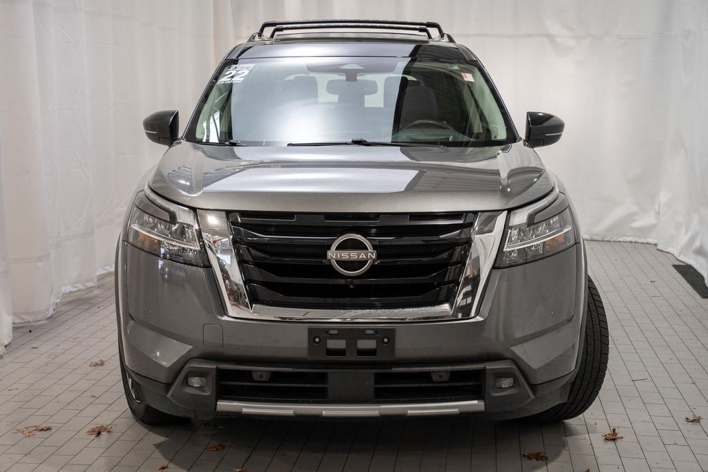 Check out all these great options Cargo Package (Cargo Area Protector, Cargo Net, and First Aid Kit), 13 Speakers, 3rd row seats: bench, 4-Wheel Disc Brakes, ABS brakes, Air Conditioning, Alloy wheels, AM/FM radio: SiriusXM, Auto High-beam Headlights, Auto tilt-away steering wheel, Auto-dimming Rear-View mirror, Automatic temperature control, Axle Ratio: TBD, Black Splash Guards (Set of 4), Bodyside moldings, Bose Premium Audio System, Brake assist, Bumpers: body-color, Captain's Chairs Carpeted Floor Mats (Set of 4), Climate Controlled Front Bucket Seats, Cross Bars, Delay-off headlights, Driver door bin, Driver vanity mirror, Dual front impact airbags, Dual front side impact airbags, Electronic Stability Control, Emergency communication system: NissanConnect Services, Exterior Parking Camera Rear, Four wheel independent suspension, Front anti-roll bar, Front Bucket Seats, Front Center Armrest, Front dual zone A/C, Front fog lights, Front reading lights, Fully automatic headlights, Garage door transmitter: HomeLink, Heads-Up Display, Heated door mirrors, Heated front seats, Heated rear seats, Heated steering wheel, Illuminated entry, Knee airbag, Leather steering wheel, Low tire pressure warning, Memory seat, Navigation system: NissanConnect Navigation, NissanConnect w/Navigation & Services, Occupant sensing airbag, Outside temperature display, Overhead airbag, Overhead console, Panic alarm, Passenger door bin, Passenger vanity mirror, Power door mirrors, Power driver seat, Power Liftgate, Power moonroof, Power passenger seat, Power steering, Power windows, Radio data system, Radio: AM/FM Audio System, Rain sensing wipers, Rear air conditioning, Rear anti-roll bar, Rear reading lights, Rear side impact airbag, Rear window defroster, Rear window wiper, Reclining 3rd row seat, Remote keyless entry, Security system, Semi-Aniline Leather Seating Surfaces, Speed control, Speed-sensing steering, Speed-Sensitive Wipers, Split folding rear seat, Spoiler, Steering wheel memory, Steering wheel mounted audio controls, Tachometer, Telescoping steering wheel, Tilt steering wheel, Traction control, Trip computer, Turn signal indicator mirrors, Variably intermittent wipers, Ventilated front seats, and Wheels: 20" Alloy w/Unique Finish *** AVAILABLE AT FRED ANDERSON NISSAN OF RALEIGH. CALL US NOW 919-787-0254*** Nissan Pathfinder Gun Metallic/Super Black Platinum 4WD 9-Speed Automatic V6