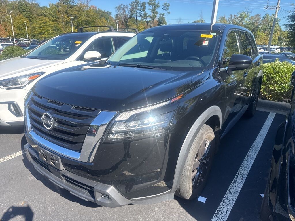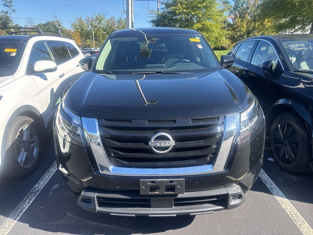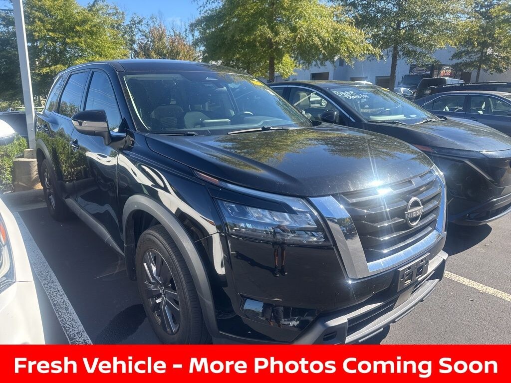 Check out all these great options 18" Painted Alloy Wheels, 3rd row seats: bench, 4-Wheel Disc Brakes, 6 Speakers, ABS brakes, Air Conditioning, Alloy wheels, AM/FM radio: SiriusXM, Auto High-beam Headlights, Automatic temperature control, Axle Ratio: 4.334, Bench Seat Carpeted Floor Mats (Set of 4), Black Splash Guards (Set of 4), Blind Spot Warning, Brake assist, Bumpers: body-color, Cloth Seating Surfaces, Delay-off headlights, Driver door bin, Driver vanity mirror, Dual front impact airbags, Dual front side impact airbags, Electronic Stability Control, Four wheel independent suspension, Front anti-roll bar, Front Bucket Seats, Front Center Armrest, Front dual zone A/C, Front reading lights, Fully automatic headlights, Illuminated entry, Knee airbag, Low tire pressure warning, NissanConnect featuring Apple CarPlay and Android Auto, Occupant sensing airbag, Outside temperature display, Overhead airbag, Overhead console, Panic alarm, Passenger door bin, Passenger vanity mirror, Power door mirrors, Power steering, Power windows, Radio data system, Radio: AM/FM Audio System w/NissanConnect, Rear air conditioning, Rear anti-roll bar, Rear Parking Sensors, Rear reading lights, Rear side impact airbag, Rear window defroster, Rear window wiper, Reclining 3rd row seat, Remote keyless entry, Security system, Speed control, Speed-sensing steering, Split folding rear seat, Spoiler, Steering wheel mounted audio controls, Tachometer, Telescoping steering wheel, Tilt steering wheel, Traction control, Trip computer, and Variably intermittent wipers *** AVAILABLE AT FRED ANDERSON NISSAN OF RALEIGH. CALL US NOW 919-787-0254*** Nissan Pathfinder Super Black S 4WD 9-Speed Automatic V6