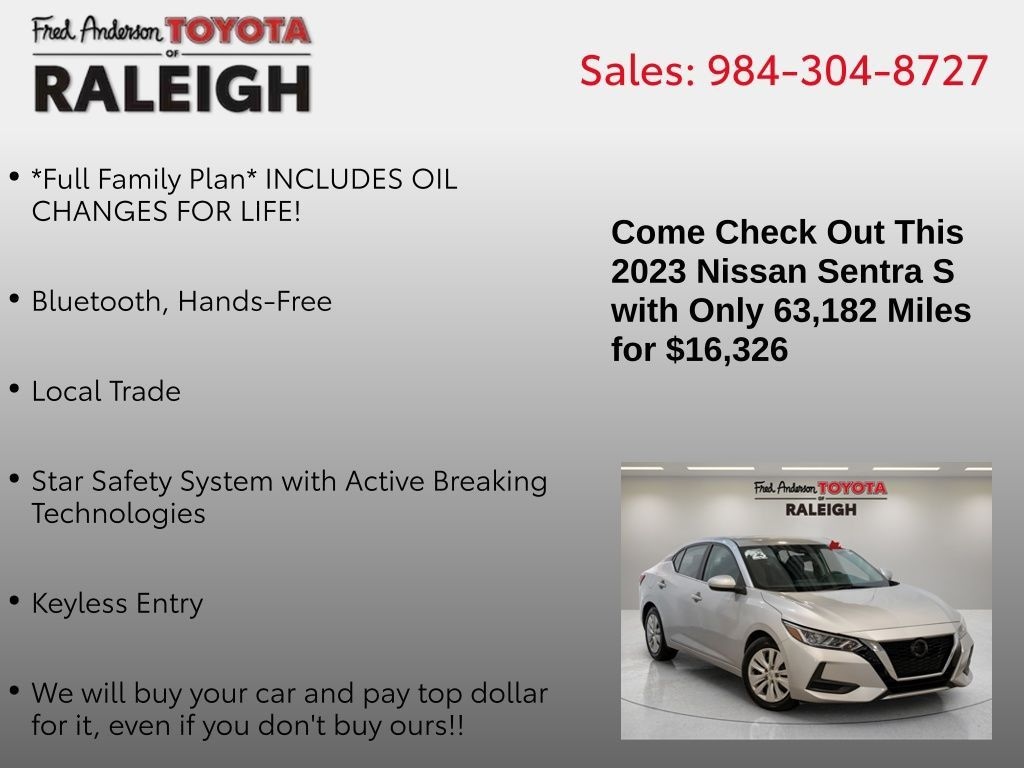 *Full Family Plan* INCLUDES OIL CHANGES FOR LIFE!, Bluetooth, Hands-Free, Local Trade, Star Safety System with Active Breaking Technologies, Keyless Entry, We will buy your car and pay top dollar for it, even if you don't buy ours!!, CVT with Xtronic, Charcoal Cloth. Check out all these great options CVT with Xtronic, Charcoal Cloth, 16" Steel Wheels w/Full Wheel Covers, 4 Speakers, ABS brakes, Air Conditioning, AM/FM radio, Auto High-beam Headlights, Blind Spot Warning, Brake assist, Bumpers: body-color, Clear Rear Bumper Protector, Cloth Seat Trim, Delay-off headlights, Driver door bin, Driver vanity mirror, Dual front impact airbags, Dual front side impact airbags, Electronic Stability Control, Four wheel independent suspension, Front anti-roll bar, Front Bucket Seats, Front Center Armrest, Front reading lights, Fully automatic headlights, Illuminated entry, Knee airbag, Low tire pressure warning, NissanConnect featuring Apple CarPlay and Android Auto, Occupant sensing airbag, Outside temperature display, Overhead airbag, Overhead console, Panic alarm, Passenger door bin, Passenger vanity mirror, Power door mirrors, Power steering, Power windows, Radio data system, Radio: AM/FM w/RDS/MP3/Aux-In, Rear anti-roll bar, Rear Parking Sensors, Rear side impact airbag, Rear window defroster, Remote keyless entry, Speed control, Speed-sensing steering, Split folding rear seat, Steering wheel mounted audio controls, Tachometer, Telescoping steering wheel, Tilt steering wheel, Traction control, Trip computer, and Variably intermittent wipersStop by and test drive today. Let us show you how affordable we can make it. Remember, we always give you more for your trade and we will buy your vehicle even if you don't buy one from us. See online @ www.FredAndersonToyota.com or see in person @ Fred Anderson Toyota 9101 Glenwood Ave. Raleigh NC, 27617. 2023 Nissan Sentra S FWD Brilliant Silver Metallic CVT with Xtronic